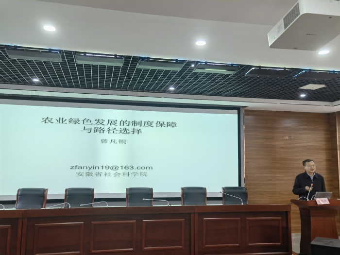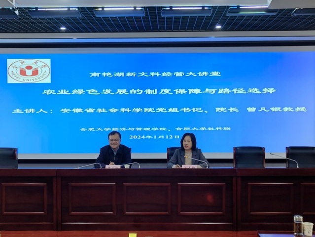 1月12号下午,经济与管理学院、校社科联在6号楼学术报告厅共同主办2024年第一期“南艳湖新文科经管大讲堂”。特邀安徽省社会科学院党组书记、院长曾凡银教授作题为“农业绿色发展的制度保障与路径选择”的学术报告。校长吴春梅教授出席并主持,永利官网师生100余人到场聆听学习。